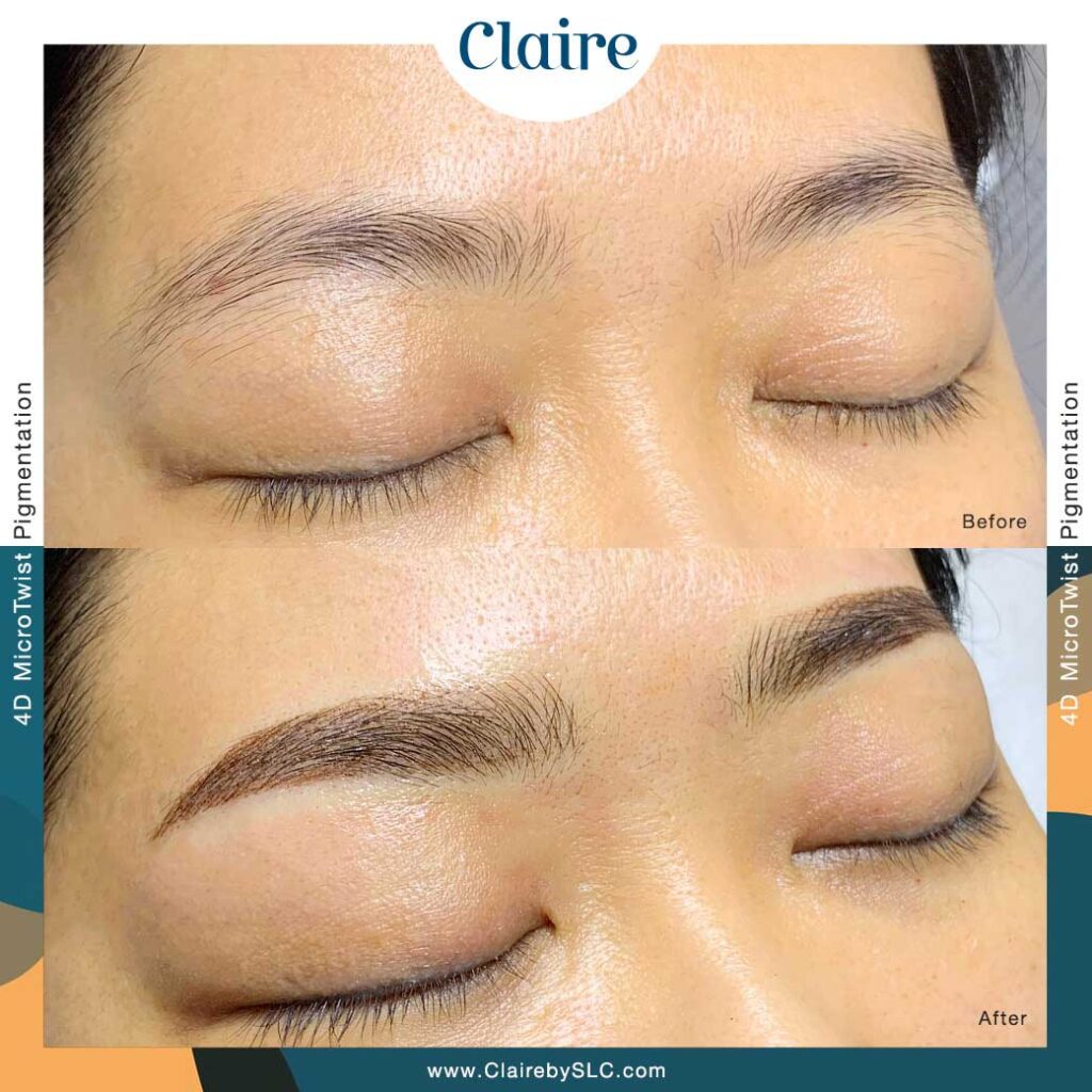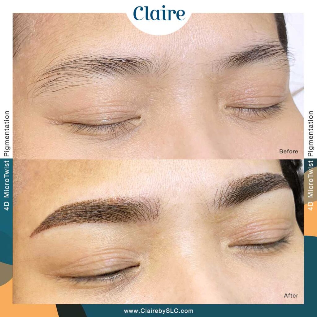แต่ไม่เท่านั้นจากปัญหาคิ้วทั้งหมดที่ได้บอกไปข้างต้น Claire ก็ยังมีอีกหนึ่งเทคนิคใหม่ล่าสุด ที่สามารถแก้ปัญหาคิ้วได้ทุกแบบ ก็คือการฝังสีคิ้ว เทคนิค 4D Micro Twist เป็นเทคนิคใหม่ล่าสุดที่ผสาน 4 เทคนิคเข้าด้วยกันได้ คือ คอนทัวร์ ลายเส้น สโตรค และดอท เป็นเทคนิคที่ไล่น้ำหนักเข้มและบาง มีความฟุ้งกระจายของเม็ดสีคล้ายเม็ดทรายบริเวณหัวคิ้วและด้านบนของแนวคิ้ว เหมาะกับคนที่มีขนคิ้วน้อย ขนคิ้วหนาไม่เสมอกัน คิ้วบาง เทคนิคนี้จะช่วยให้คิ้วดูมีมิติคมชัดมากขึ้น