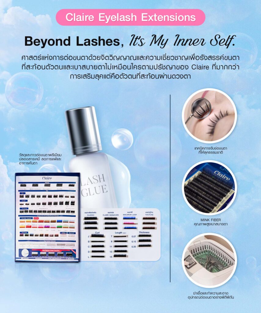 - Claire Organic Medical Adhesive & Sterile Care ใช้กาวออร์แกนิกเกรดการแพทย์ที่อ่อนโยนต่อดวงตา และมาตรฐานการฆ่าเชื้ออุปกรณ์ทุกชิ้นอย่างเคร่งครัด เพื่อความสะอาดปลอดภัยสูงสุดของดวงตา