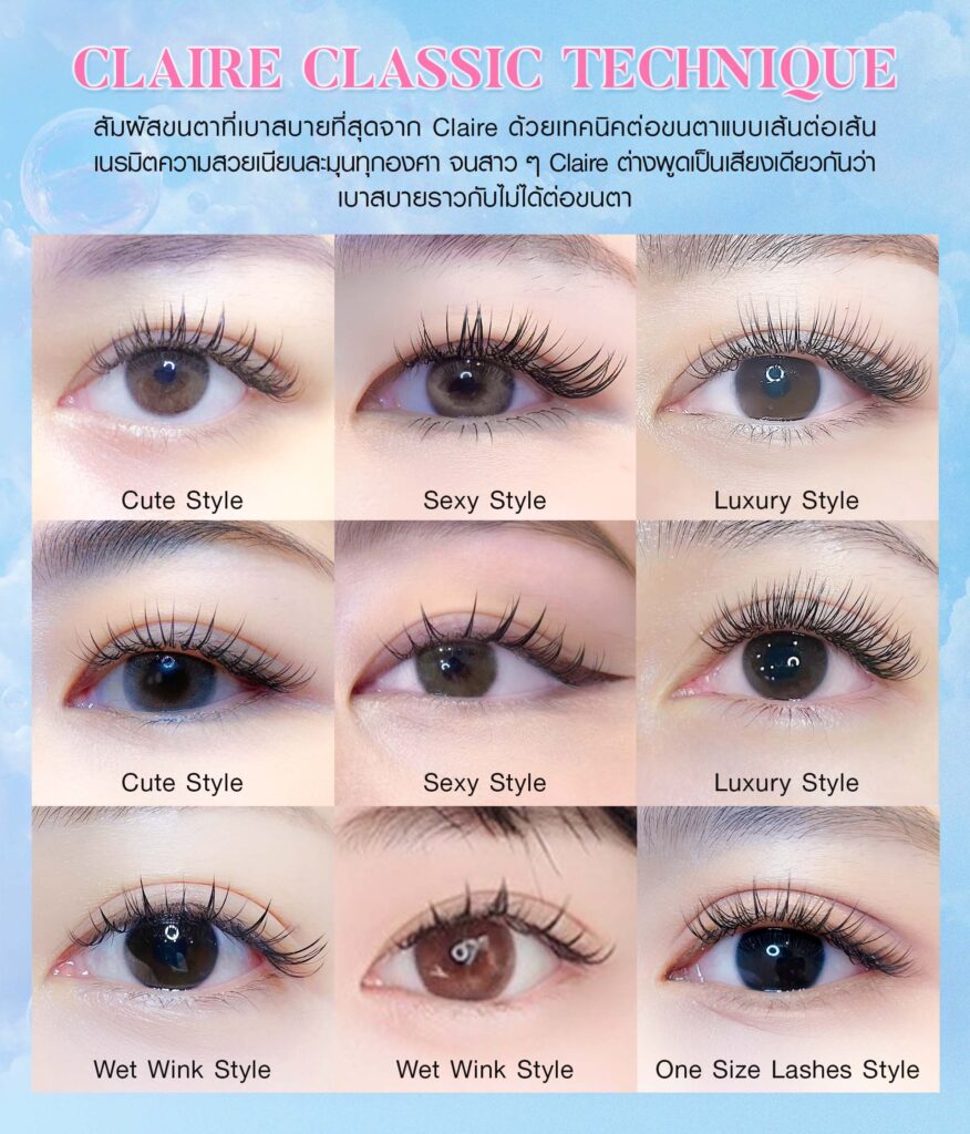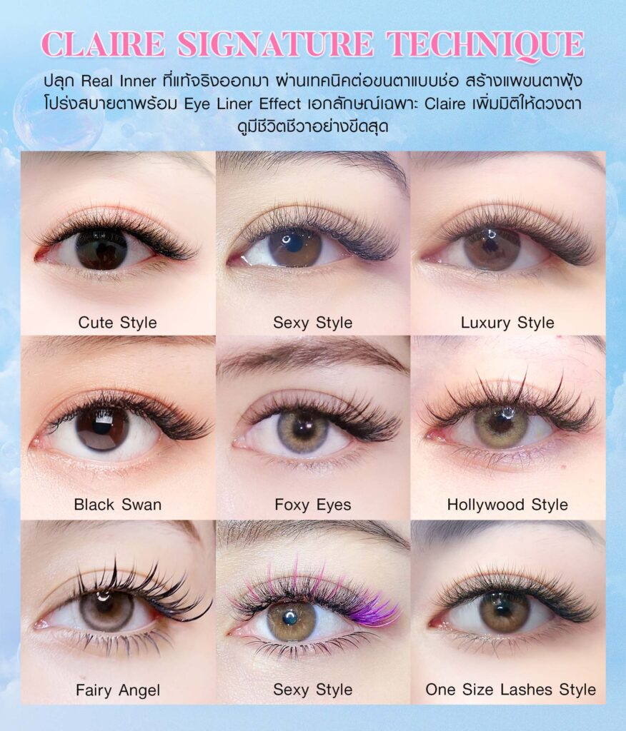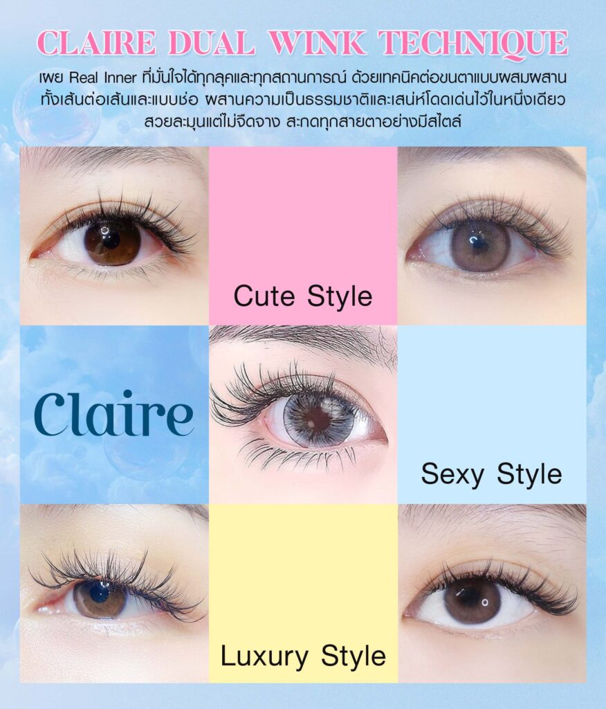 - Claire Signature Technique เทคนิคต่อขนตาเอกลักษณ์ของ Claire ร่วมพัฒนากับ Professional Stylist จากเกาหลีและไต้หวัน มุ่งเน้นที่ความเบาสบายตา ถนอมขนตาจริง และการเลือกขนตาให้เหมาะกับรูปหน้า ไลฟ์สไตล์ และสุขภาพขนตาจริง
