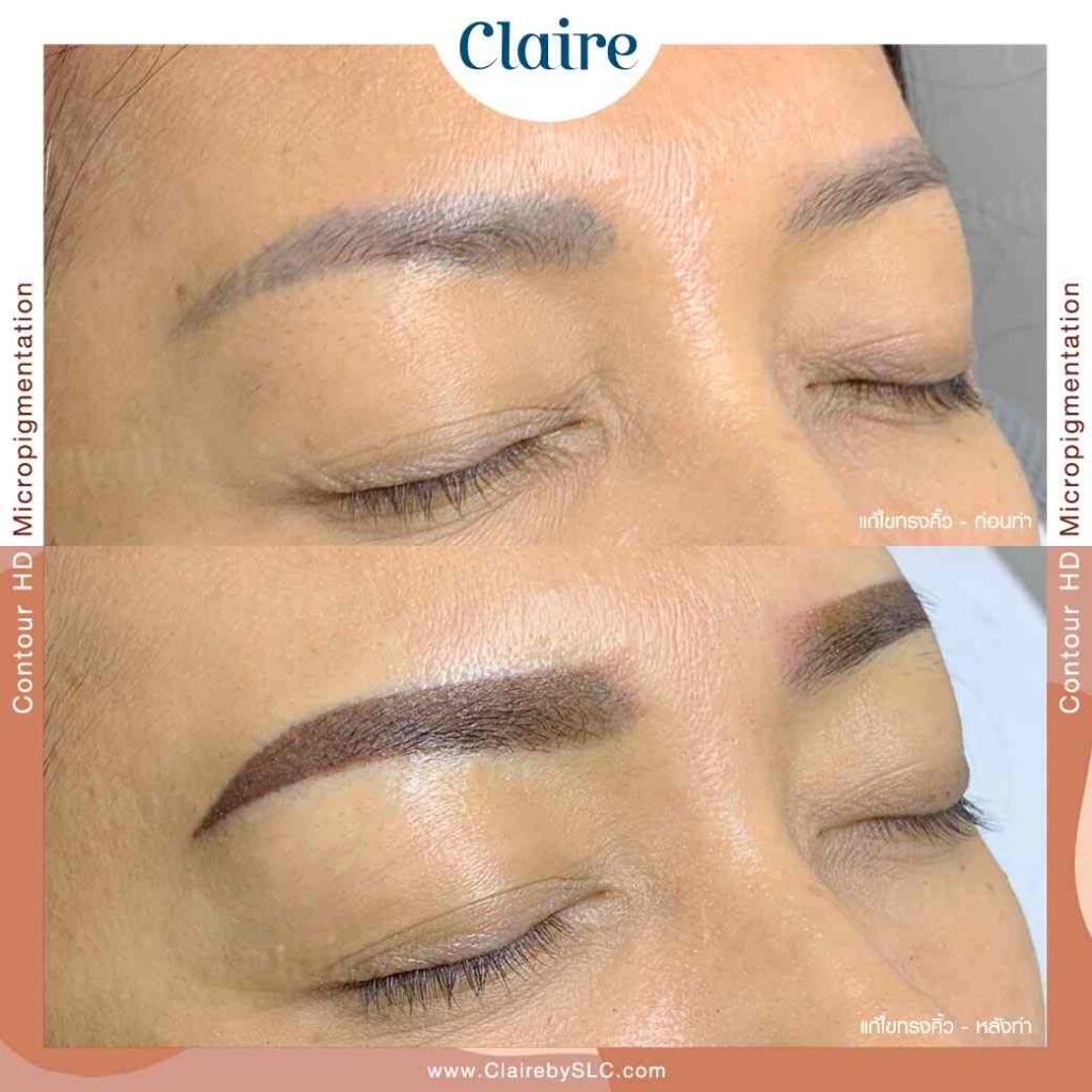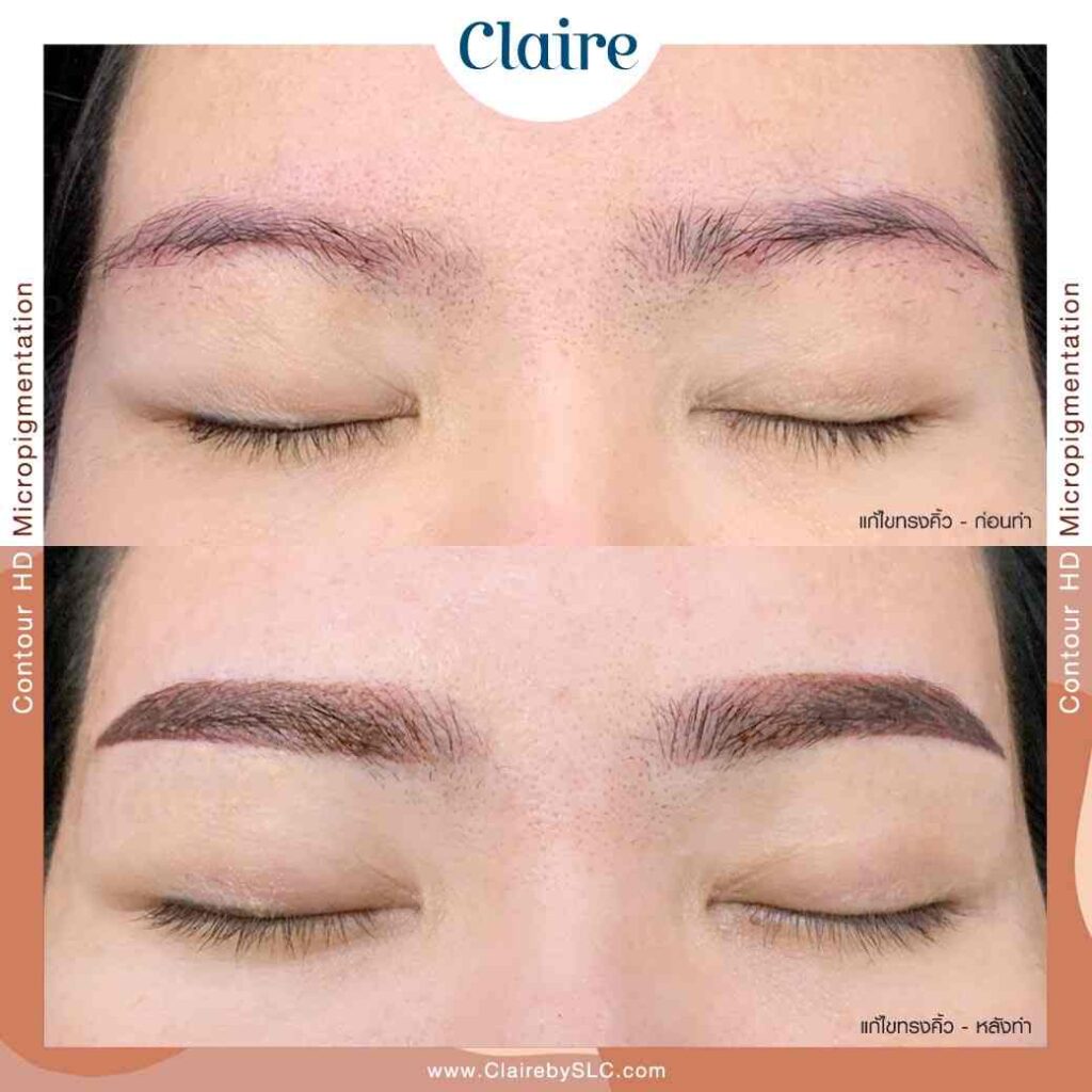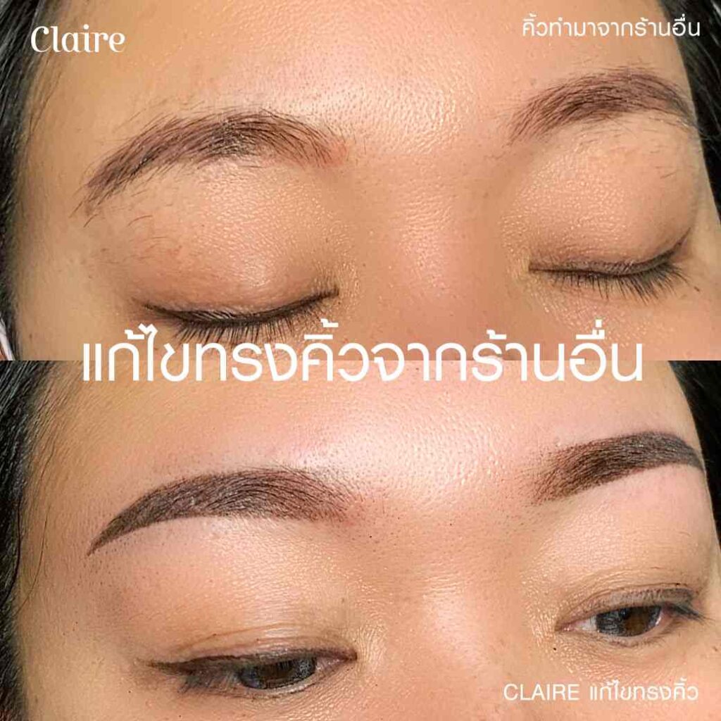 หลังจากไม่มีคิ้วแล้วมันก็อยู่ไม่ได้ ต้องหาทำคิ้วใหม่ด่วนๆ โดยการฝังสีคิ้วที่ Claire สามารถกลบรอยสักคิ้วเดิมได้ด้วยเทคโนโลยีเครื่อง Micropigmentation เป็นการฝังสีที่ไม่ได้ลงลึกเหมือนการสักแบบเดิม มันดีกว่าตรงที่ทำให้ได้คิ้วที่เป็นธรรมชาติมาก ไม่โป๊ะ ไม่เป็นคิ้วเขียว จุดเด่นที่เลิศอีกอย่างก็คือ การฝังสีคิ้วจะอยู่ติดประมาณ 2 ปี คิ้วจะมีการจางลงเล็กน้อย จึงทำให้สามารถเปลี่ยนรูปทรงคิ้วตามเทรนด์ใหม่ได้ แบบไม่ต้องไปเลเซอร์ลบรอยสักคิ้วให้เจ็บตัวอีก