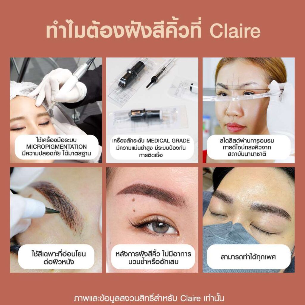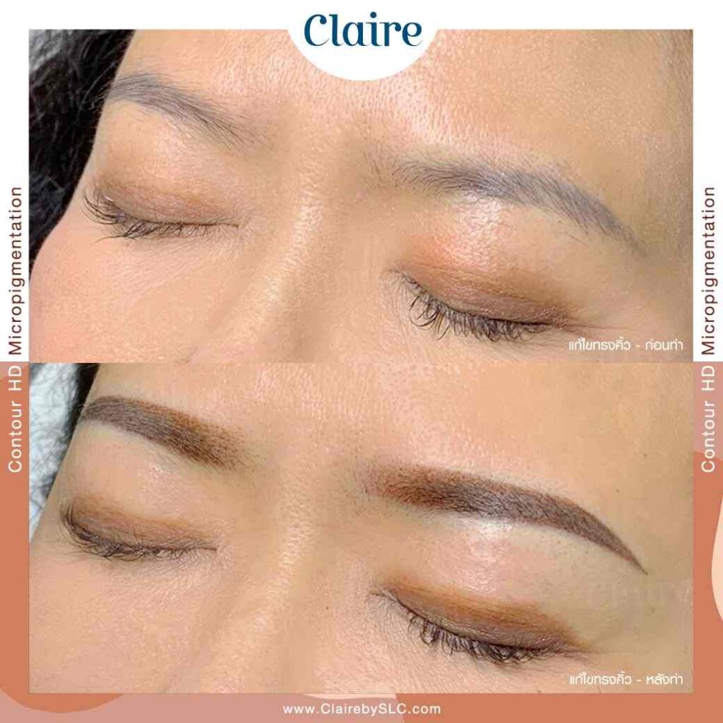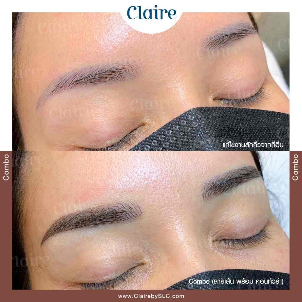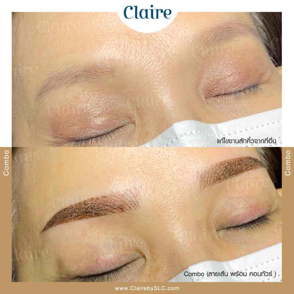 หลังจากไม่มีคิ้วแล้วมันก็อยู่ไม่ได้ ต้องหาทำคิ้วใหม่ด่วนๆ โดยการฝังสีคิ้วที่ Claire สามารถกลบรอยสักคิ้วเดิมได้ด้วยเทคโนโลยีเครื่อง Micropigmentation เป็นการฝังสีที่ไม่ได้ลงลึกเหมือนการสักแบบเดิม มันดีกว่าตรงที่ทำให้ได้คิ้วที่เป็นธรรมชาติมาก ไม่โป๊ะ ไม่เป็นคิ้วเขียว จุดเด่นที่เลิศอีกอย่างก็คือ การฝังสีคิ้วจะอยู่ติดประมาณ 2 ปี คิ้วจะมีการจางลงเล็กน้อย จึงทำให้สามารถเปลี่ยนรูปทรงคิ้วตามเทรนด์ใหม่ได้ แบบไม่ต้องไปเลเซอร์ลบรอยสักคิ้วให้เจ็บตัวอีก