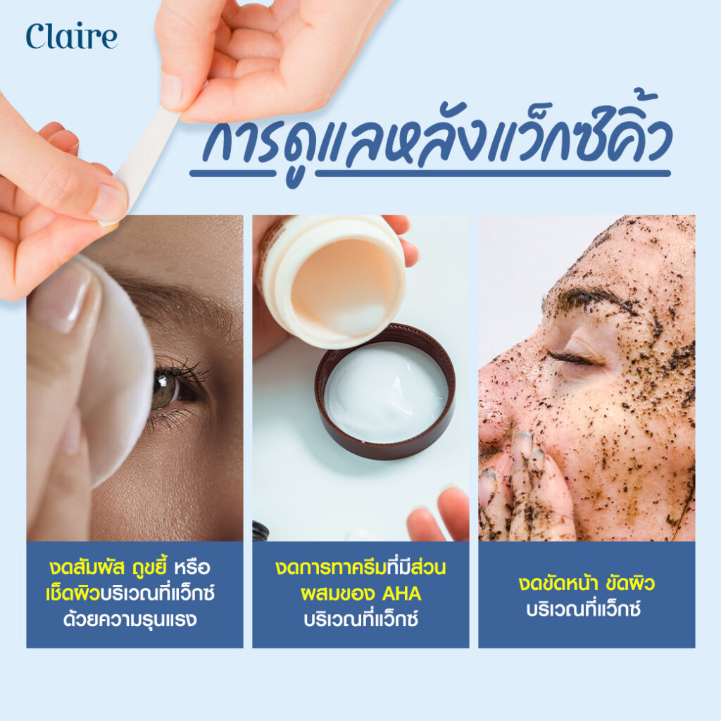 - งดสครับและสกินแคร์ผลัดเซลล์ผิว ก่อนไปแว็กซ์คิ้วประมาณ 3-5 วัน ควรหยุดใช้ผลิตภัณฑ์ที่มีส่วนผสมของ Retinol, AHA, BHA บริเวณคิ้ว เพราะจะทำให้ผิวบางและไวต่อการระคายเคือง