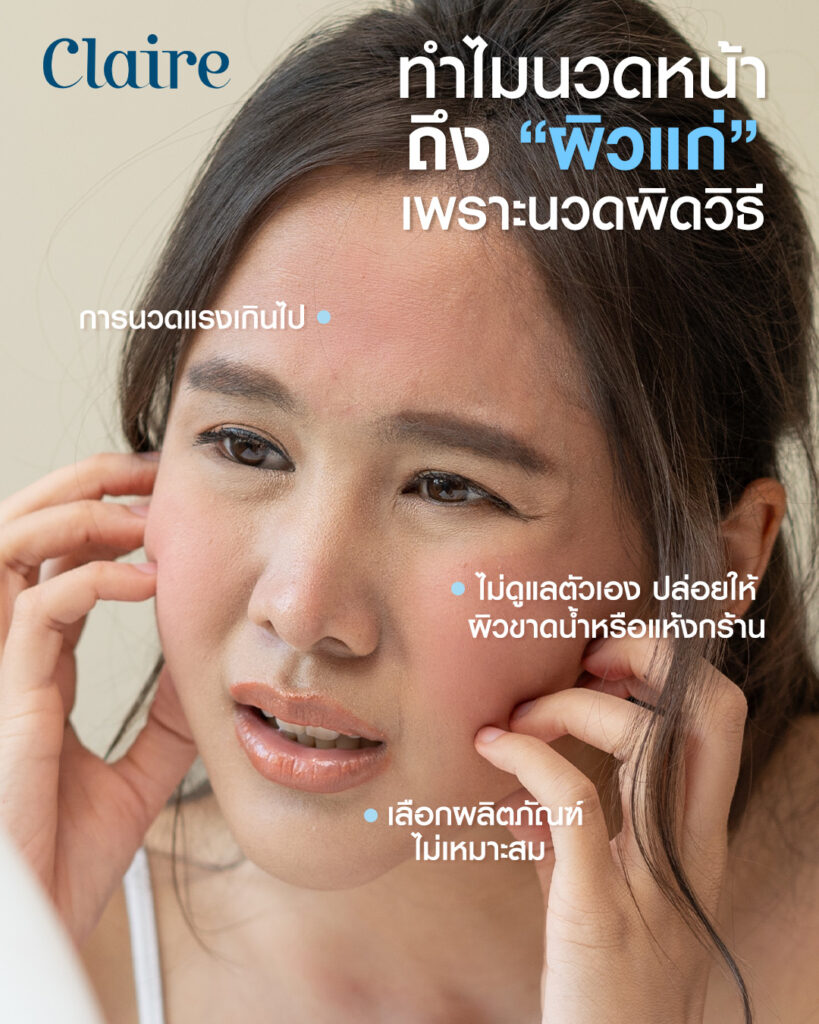 - ไม่ดูแลตัวเอง ถ้านวดแล้วไม่ตามด้วยการบำรุงที่เหมาะสม เช่น ไม่ใช้ครีมกันแดด ปล่อยให้ผิวขาดน้ำหรือแห้งกร้าน ปัจจัยเหล่านี้เลยทำให้ผิวแก่ลงซึ่งไม่เกี่ยวกับการนวดหน้าเลยค่ะ