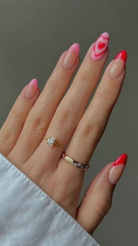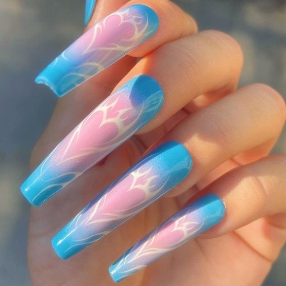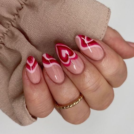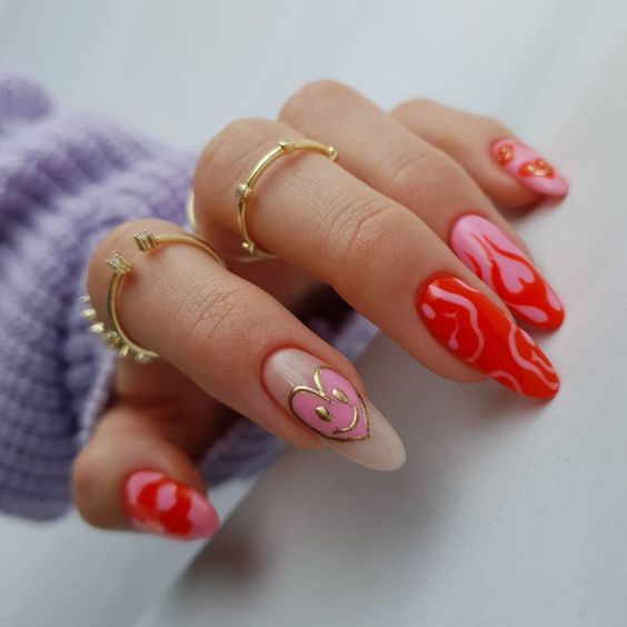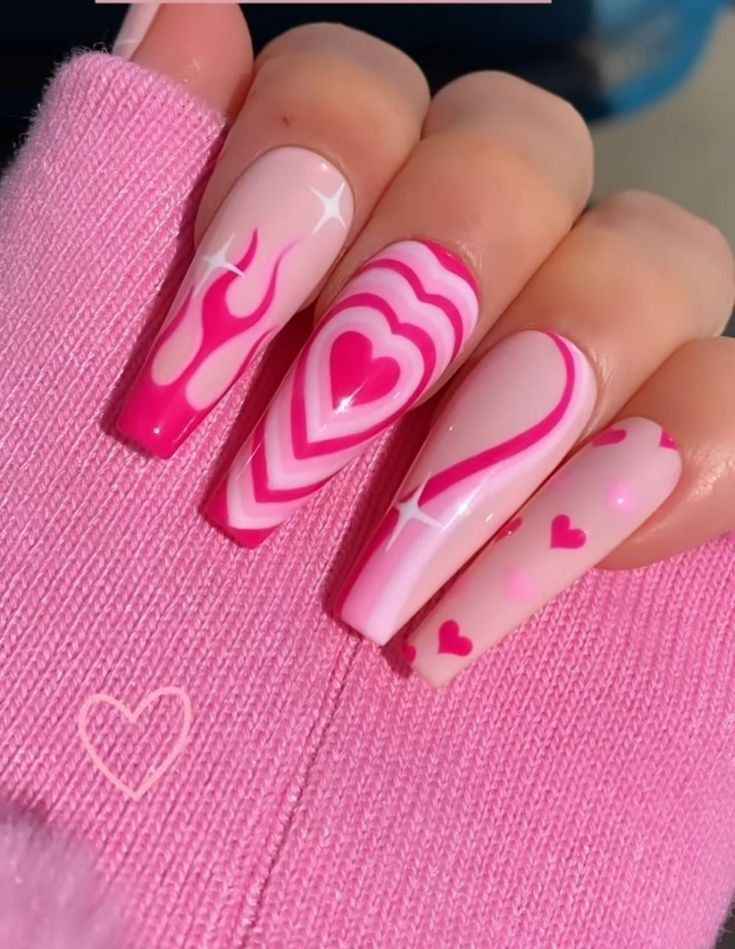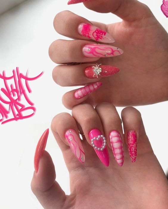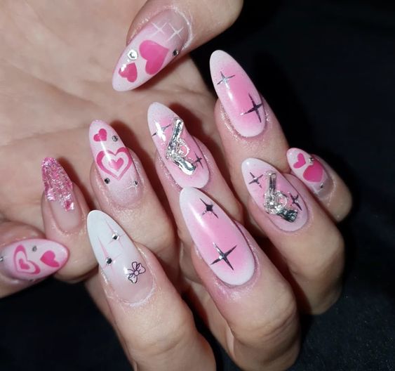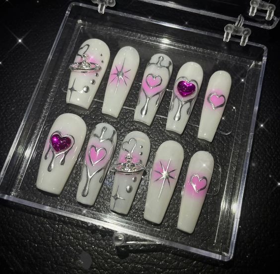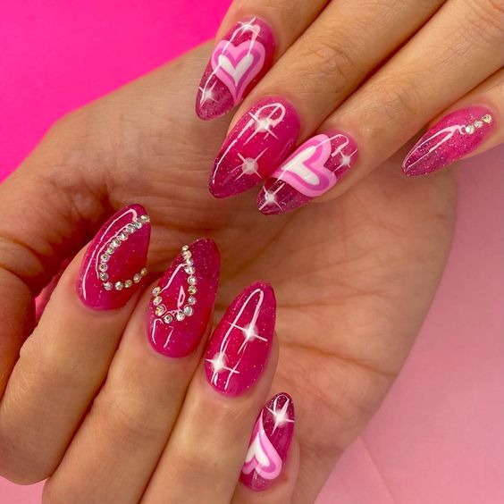วาเลนไทน์ก็ต้องชมพูเด่นกันหน่อย หัวใจก็ต้องมีจะดวงเล็กดวงใหญ่ ประโคมเข้าไปได้เลย เพิ่มสไตล์ Y2K ด้วยกลิตเตอร์กับความวิบวับ ถ่ายรูปแบบโชว์เล็บก็คือเลิศ