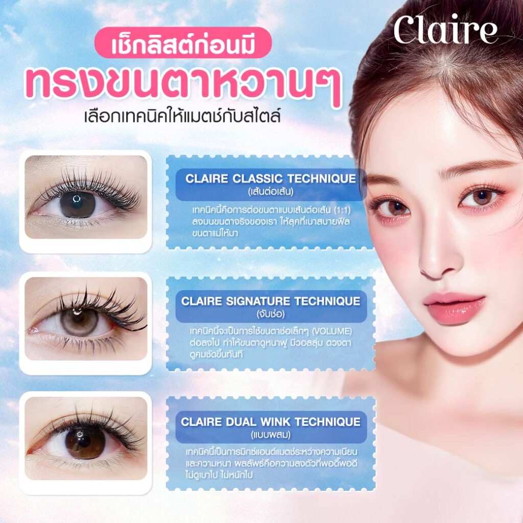 - Claire Signature Technique (จับช่อ) สำหรับสายที่ต้องการความหนาความจึ้ง! เทคนิคนี้จะเป็นการใช้ขนตาช่อเล็กๆ (Volume) ต่อลงไป ทำให้ขนตาดูหนาฟู มีวอลลุ่ม ดวงตาดูคมชัดขึ้นทันที เหมาะกับสาวขนตาน้อย หรือคนที่ชอบแต่งหน้าจัดเต็ม อยากให้ดวงตาดูโดดเด่น