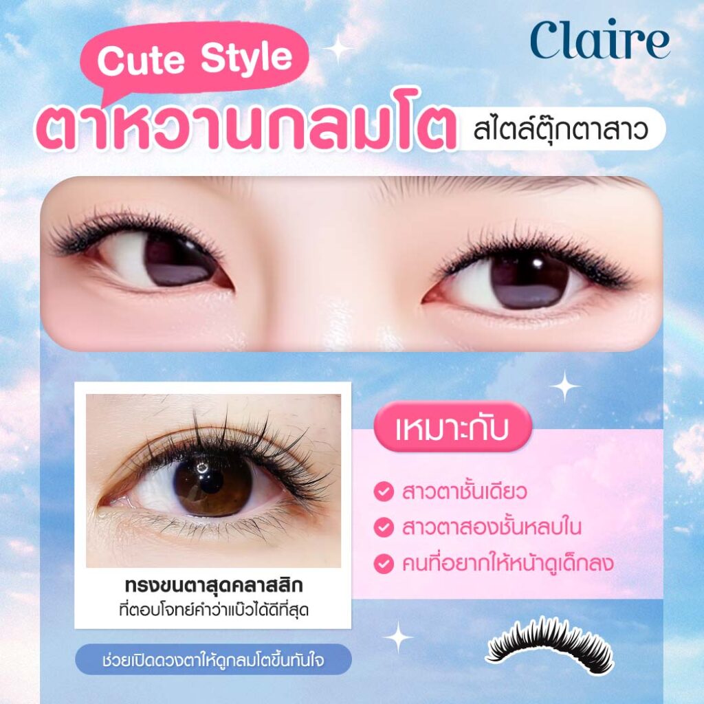 - เหมาะกับสาวตาชั้นเดียว สาวตาสองชั้นหลบใน หรือคนที่อยากให้หน้าดูเด็กลง ทรงนี้คือคำตอบของ ทรงต่อขนตาหวานๆ แบบน่ารักใสๆ