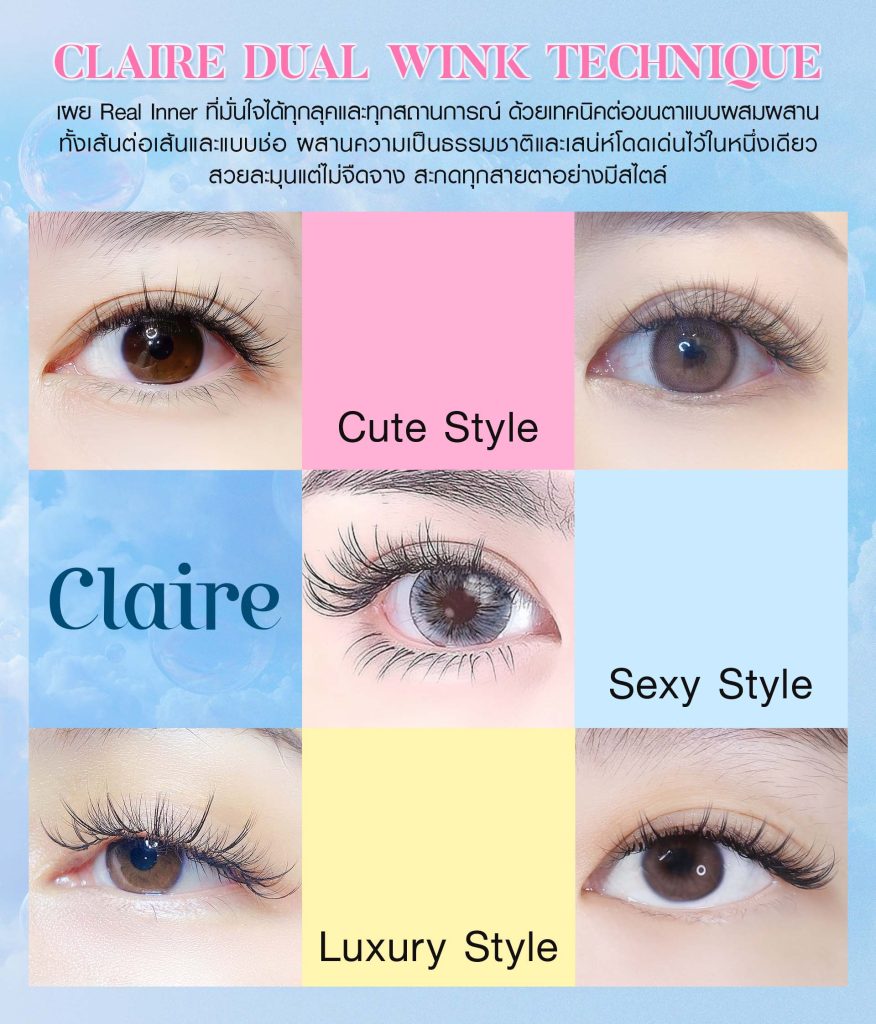 Claire Signature Technique เทคนิคการจับช่อขนตาพิเศษที่เดียวที่แรกในเมืองไทย! จากการพัฒนาร่วมกับ Professional Stylist จากเกาหลีและไต้หวัน จึงทำให้ได้ช่อขนตาทีสวยโปร่งดูเป็นธรรมชาติ พร้อม Eye Liner Effect ให้คอมพลีตลุคดวงตาดูกลมโตอย่างเป็นธรรมชาติและเบาสบาย มีให้เลือกทั้งหมด 7 ทรง
