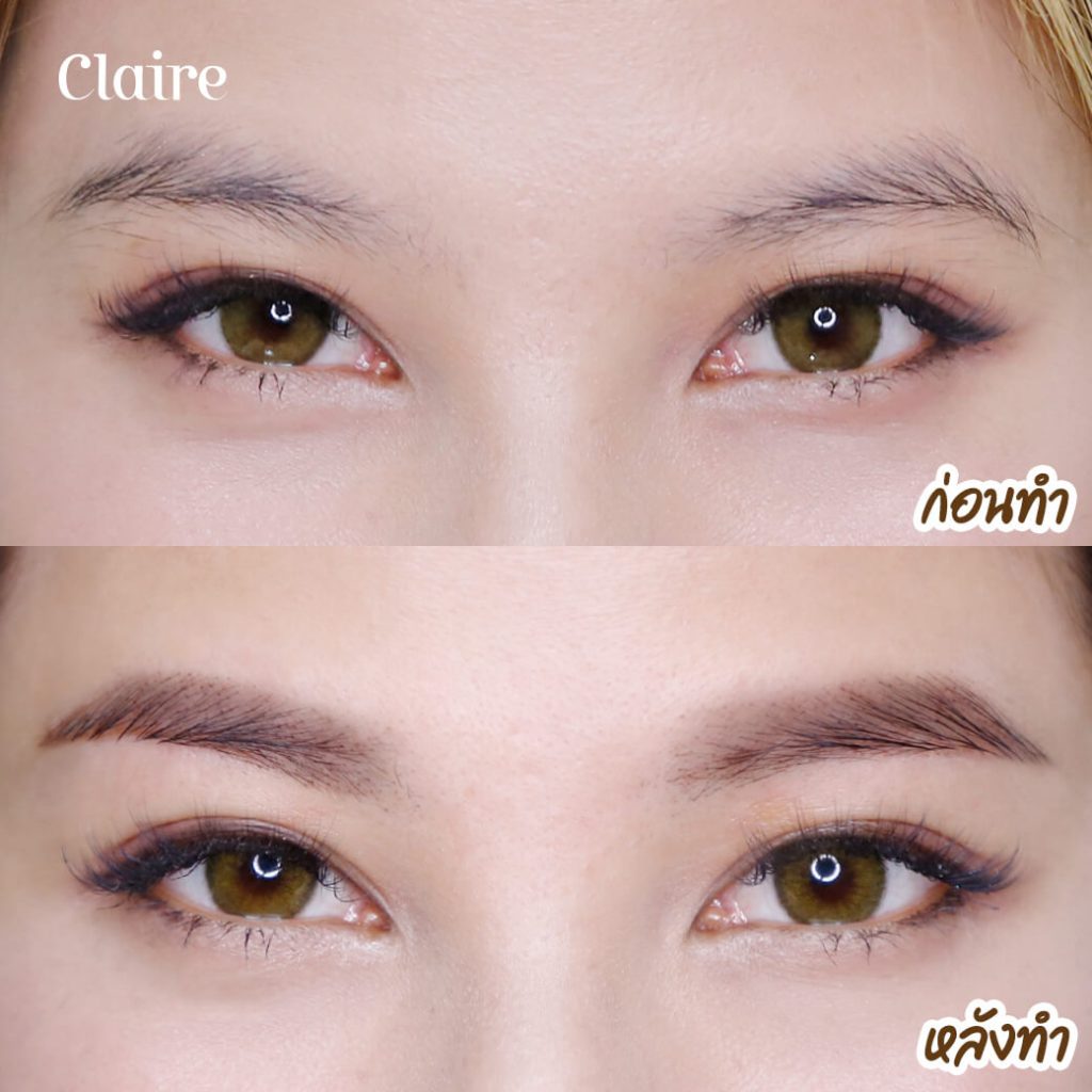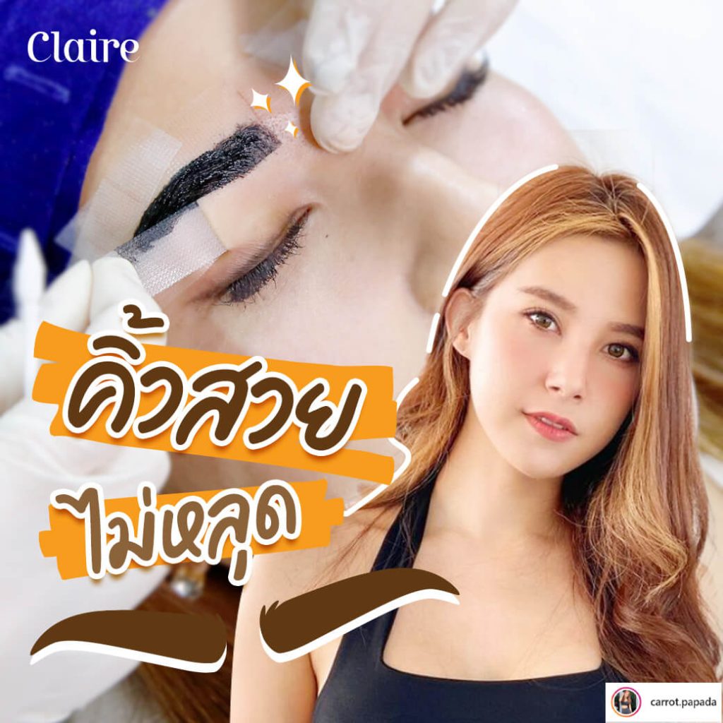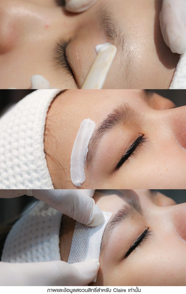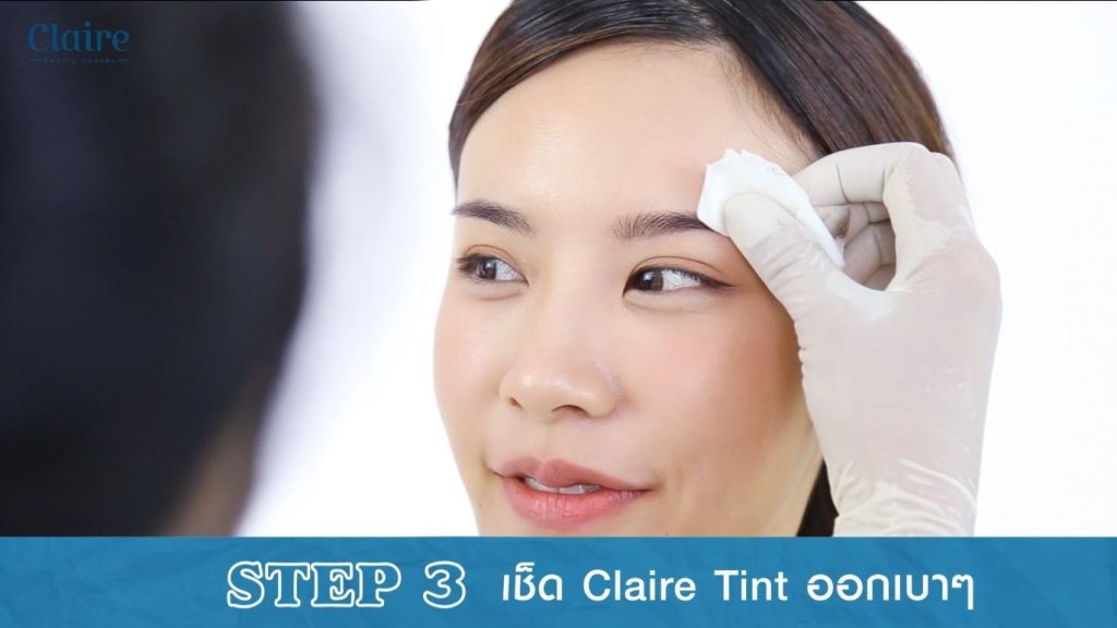 เทคนิคการมีคิ้วสวยเป๊ะติดทนนาน 5-7 วัน แบบไม่ต้องลงเข็ม ไม่เจ็บตัว การลงสี Tint คิ้วหนึ่งเดียวจากแคลร์ โดยสไตลิสต์จะออกแบบทรงคิ้วให้เหมาะสมกับรูปหน้าหรือตามความต้องการ หลังจากนั้นเลือกสี Tint คิ้วที่ต้องการ ต่อมาจะเป็นการไล่ลงสีจากหัวคิ้วไปยังปลายคิ้ว สี Tint คิ้วสามารถติดอยู่ได้นาน 5-7 วัน โดยไม่ต้องเขียนคิ้วเพิ่มเติม