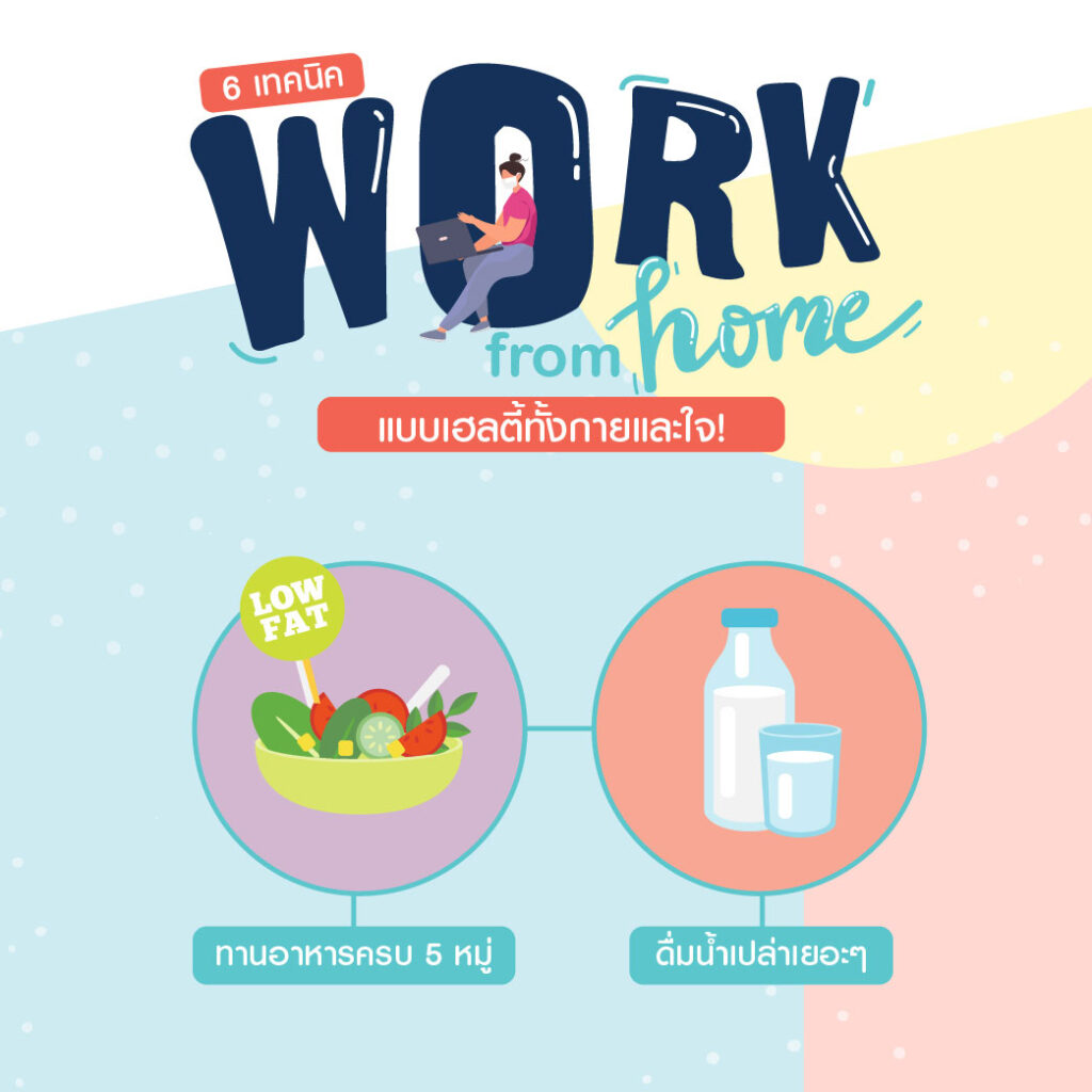 2. อาหารต้องใส่ใจ เป็นช่วงที่ได้ดูแลตัวเองมากเป็นพิเศษก็ต้องเลือกรับประทานอาหารที่มีประโยชน์ รับประทานให้ครบทั้ง 5 หมู่ แต่อาจจะเน้นเป็นพวกผักผลไม้มากกว่า ของมันของทอด เพราะการทำงานที่บ้านเรียกได้ว่าไม่ได้เดินทางเลย ก็อาจจะทำให้อ้วนได้ง่าย หรือไม่ควรตามใจปากตัวเองมากเกินไป ที่สำคัญดื่มน้ำเปล่าเยอะๆ ด้วย
