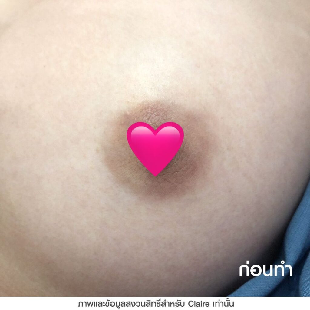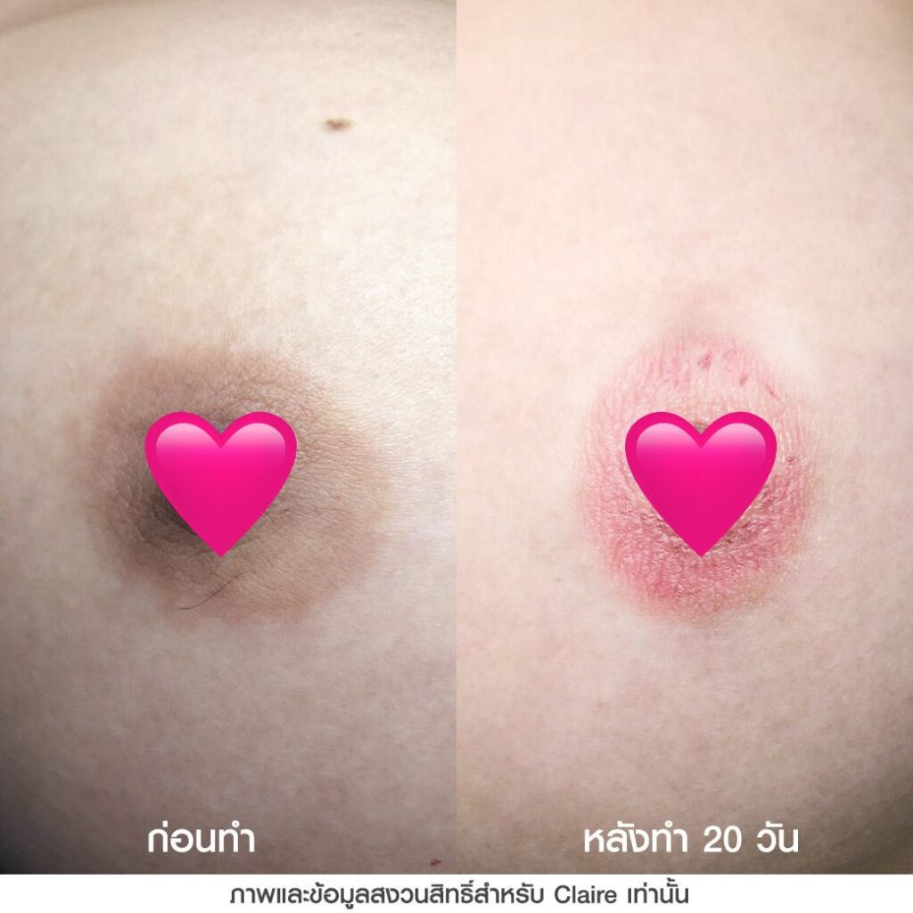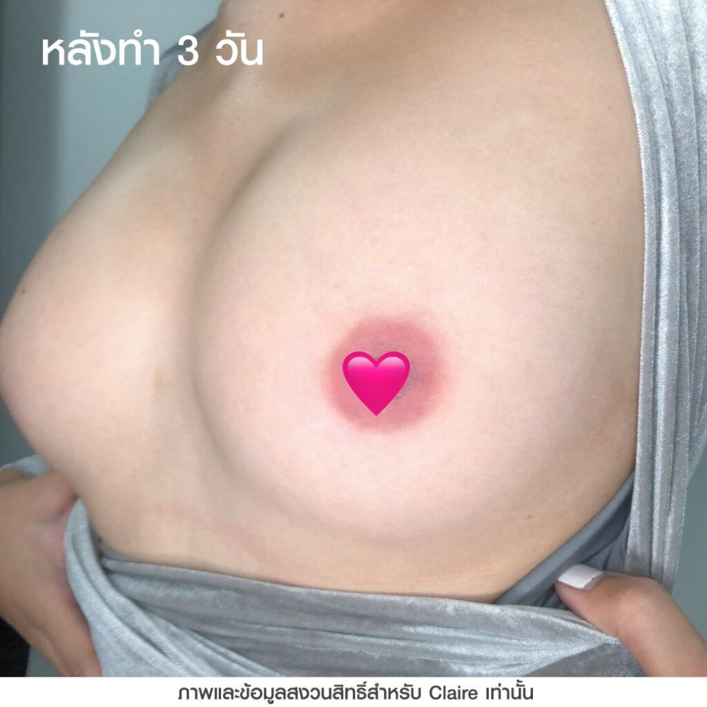 เคสนี้ได้ฝังสีปานนม Claire 1 ครั้ง หลังทำทันทีสีปานนมจะได้สีตามสีที่ลงไว้ ระหว่างที่รอลอกสีปานนมจะเข้มขึ้น โดยหลังจากสีลอกผลลัพธ์ที่ได้ก็ทำให้สีปานนมมีความสว่างขึ้นประมาณ 10-20% อาจจะไม่ได้สว่างหรืออมชมพูมาก ซึ่งต้องบอกว่าการฝังสีปานนมจะมีความแตกต่างกับการฝังสีปากที่หลังฝังสีปากสีริมฝีปากที่ได้จะสว่างและอมชมพูขึ้นทันที แต่การฝังสีปานนมหลังทำครั้งแรกจะมีความเข้ม