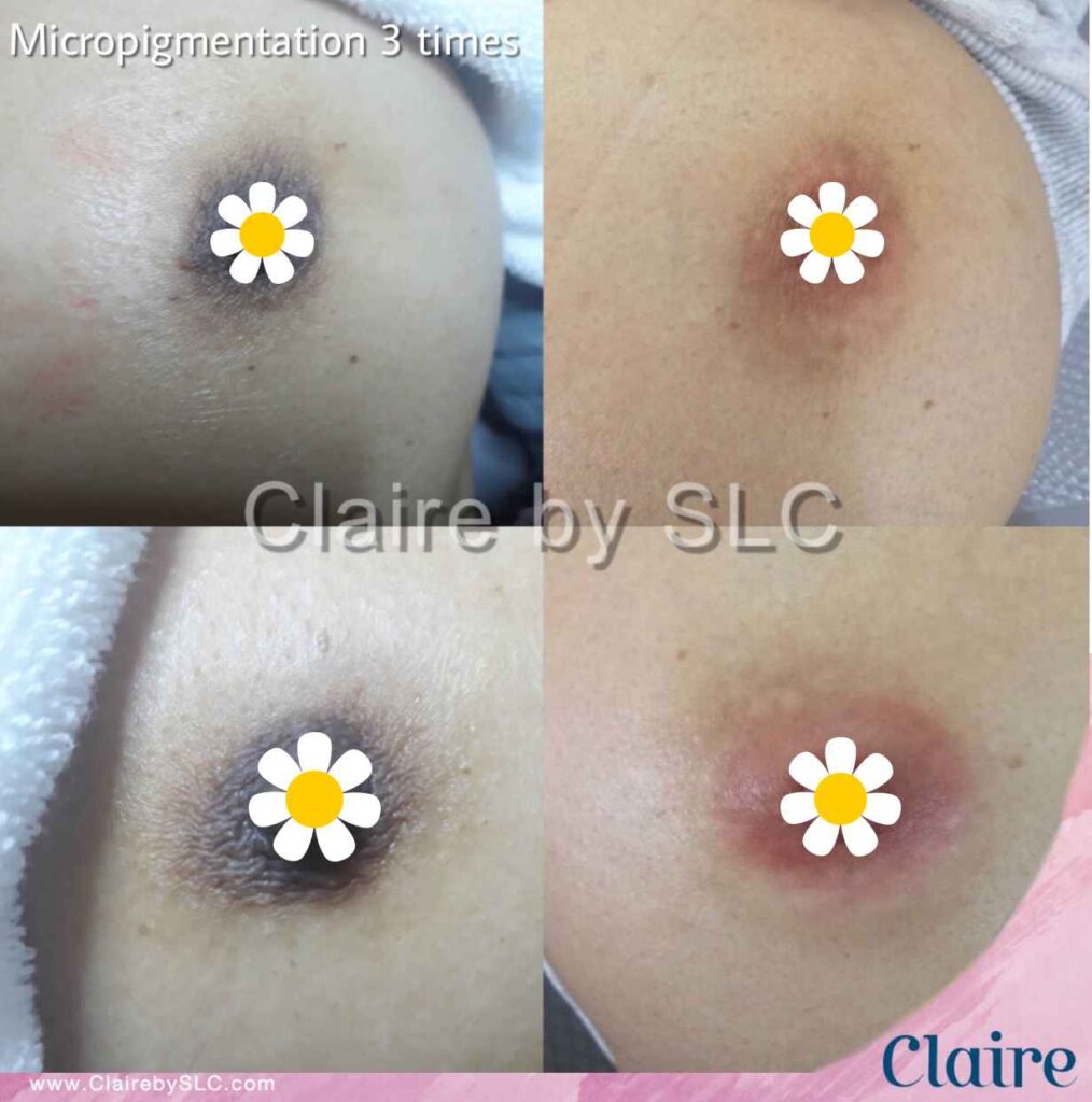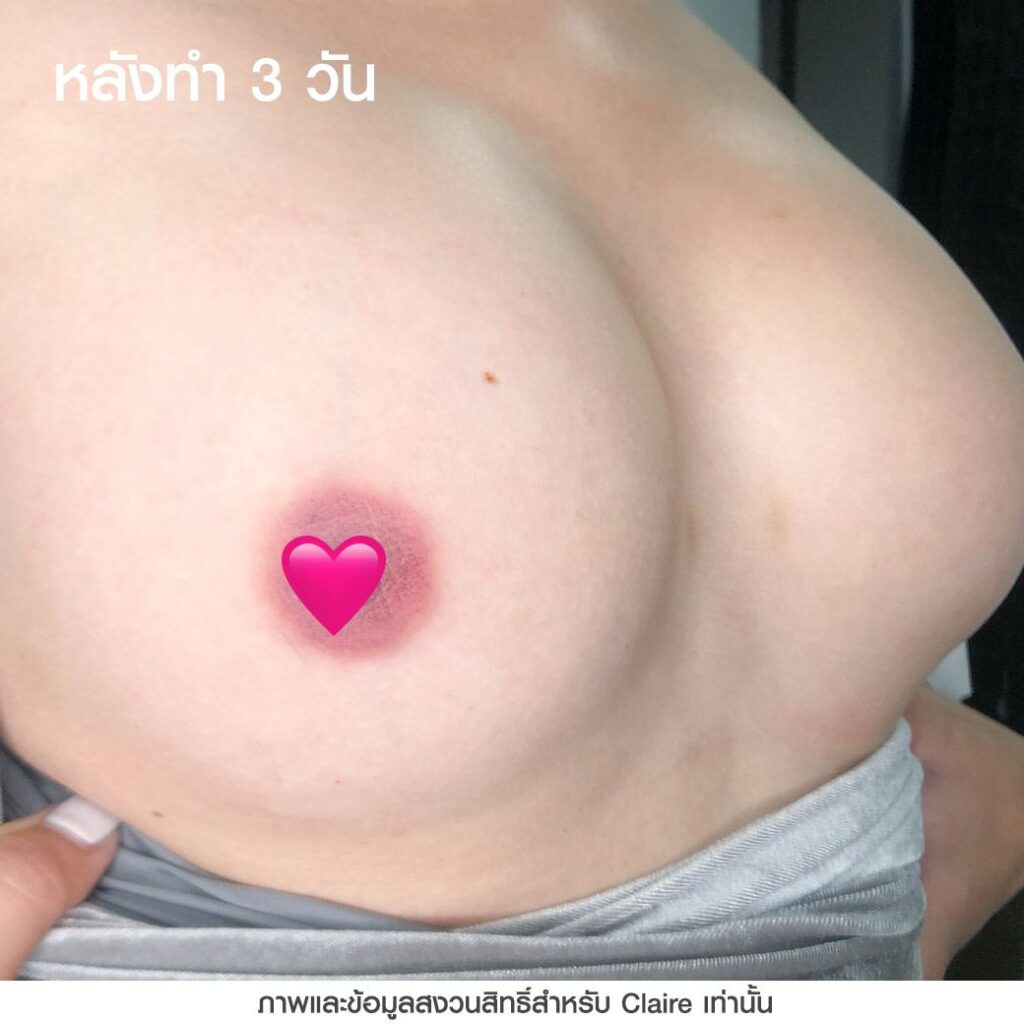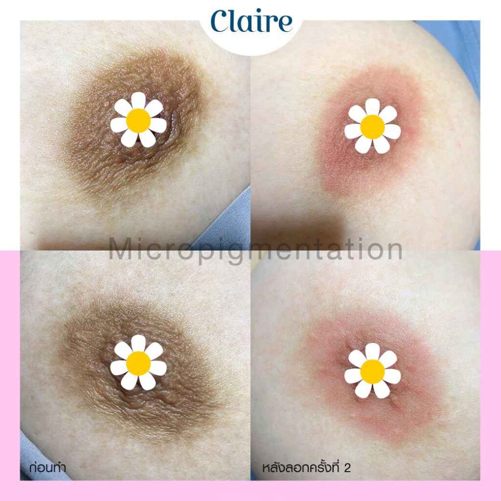เคสนี้ได้ฝังสีปานนม Claire 1 ครั้ง หลังทำทันทีสีปานนมจะได้สีตามสีที่ลงไว้ ระหว่างที่รอลอกสีปานนมจะเข้มขึ้น โดยหลังจากสีลอกผลลัพธ์ที่ได้ก็ทำให้สีปานนมมีความสว่างขึ้นประมาณ 10-20% อาจจะไม่ได้สว่างหรืออมชมพูมาก ซึ่งต้องบอกว่าการฝังสีปานนมจะมีความแตกต่างกับการฝังสีปากที่หลังฝังสีปากสีริมฝีปากที่ได้จะสว่างและอมชมพูขึ้นทันที แต่การฝังสีปานนมหลังทำครั้งแรกจะมีความเข้ม