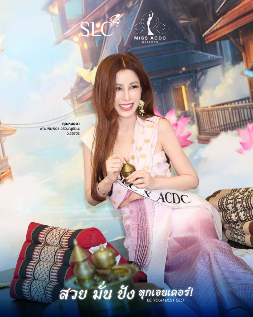 สำหรับปีนี้ SLC ไม่ได้ร่วมงาน MISS ACDC เพียงในบทบาทผู้สนับสนุนเท่านั้น หากยังได้สะท้อนวิสัยทัศน์ด้านความงามยุคใหม่ของผู้นำองค์กร ได้แก่ แพทย์หญิงพิมพิดา วรัญญูรัตนะ (ว. 26703) – Chief Executive Officer และ คุณนิสา ทั่งทอง – Chief Marketing Officer ซึ่งให้ความสำคัญกับการยกระดับความงามในเชิงลึกอย่างมีความหมายและมีมาตรฐาน ภายใต้แนวคิด “Be Your Best Self – สวย มั่น ปัง ทุกเจนเดอร์” SLC เชื่อมั่นว่า ความงามควรเป็นพื้นที่ที่เปิดกว้างสำหรับทุกคน ไม่จำกัดวัย ไร้ข้อจำกัดด้านรูปแบบ และไม่จำเป็นต้องถูกตีความภายใต้กรอบใดกรอบหนึ่ง แต่คือการส่งเสริมให้แต่ละบุคคลได้เผยตัวตนในรูปแบบที่สอดคล้องกับบุคลิกภาพของตนเองอย่างแท้จริง